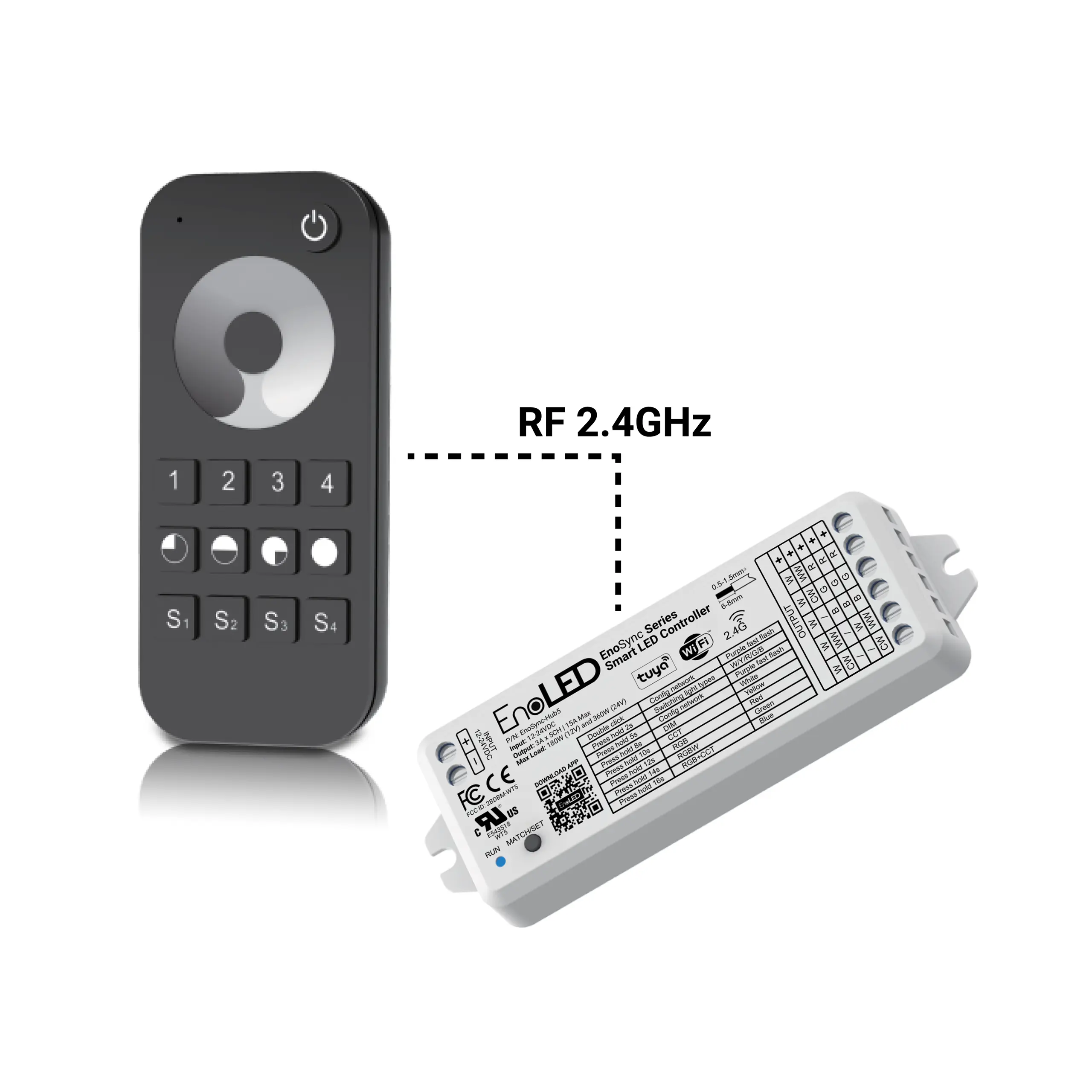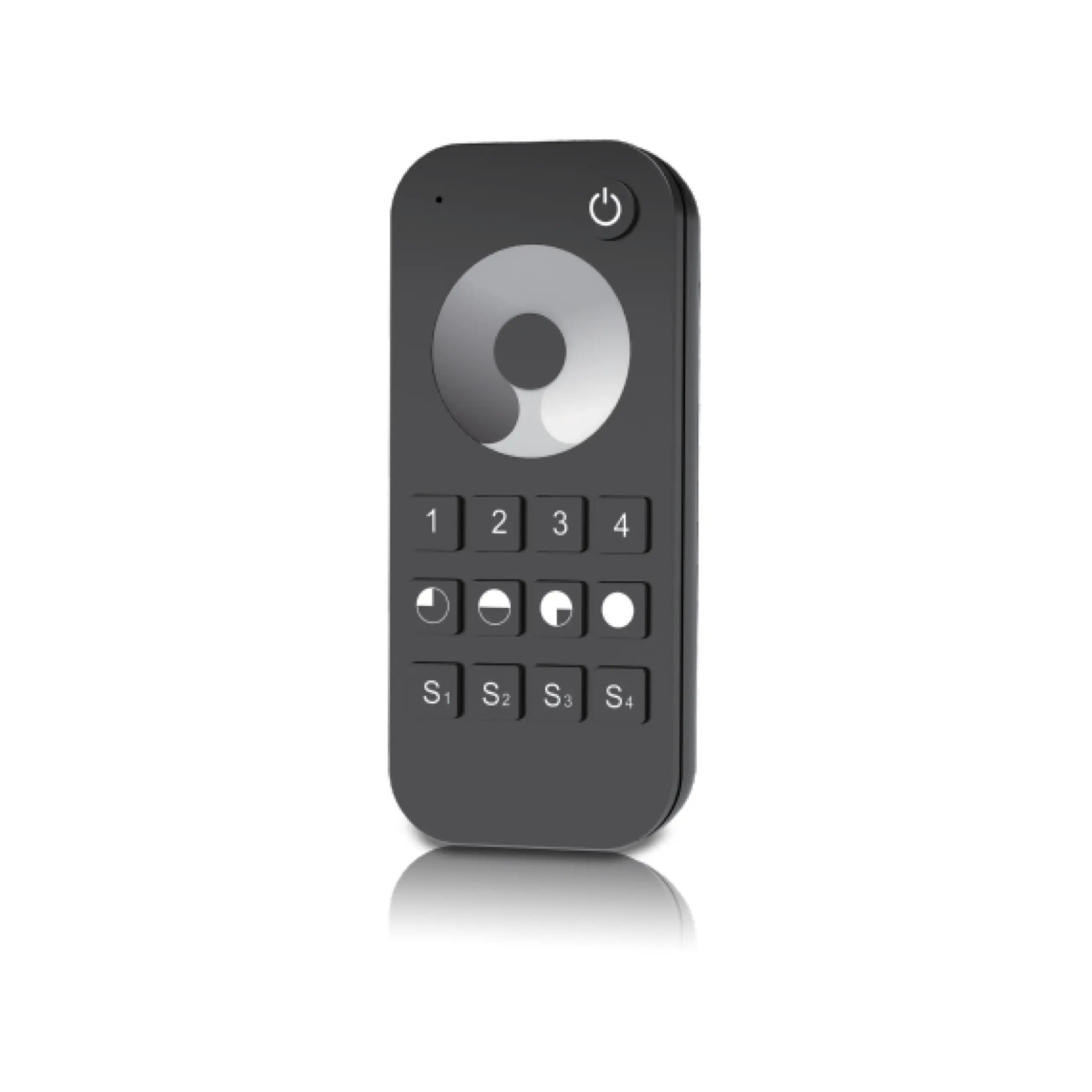 The ES-RT-Z4-Dim is a 4-zone dimming remote designed for single-color LED installations. It provides smooth brightness control using an ultra-responsive touch wheel and allows one remote to operate multiple EnoSync LED controllers. Ideal for residential and commercial dimming applications with quick scene recall.